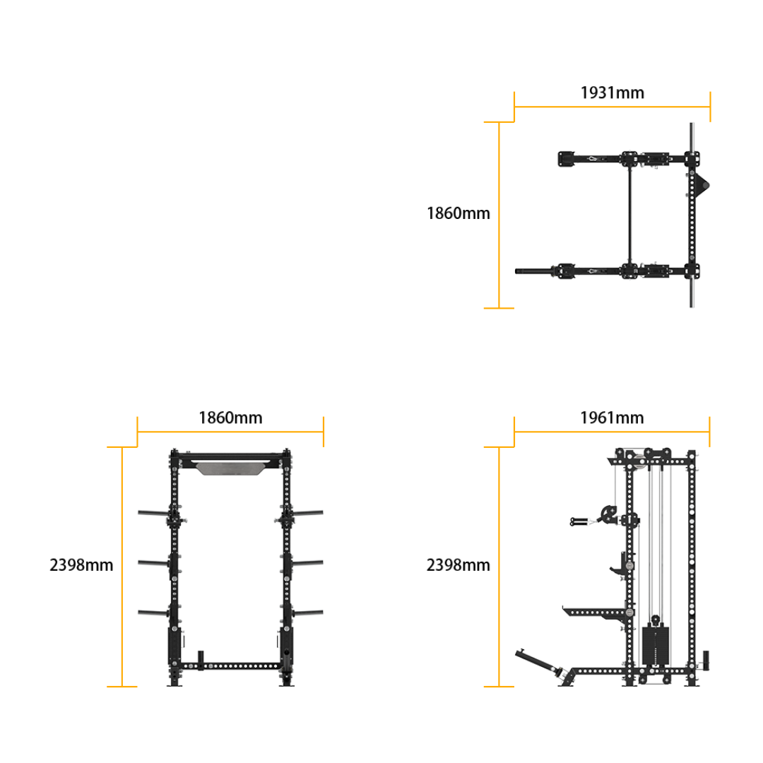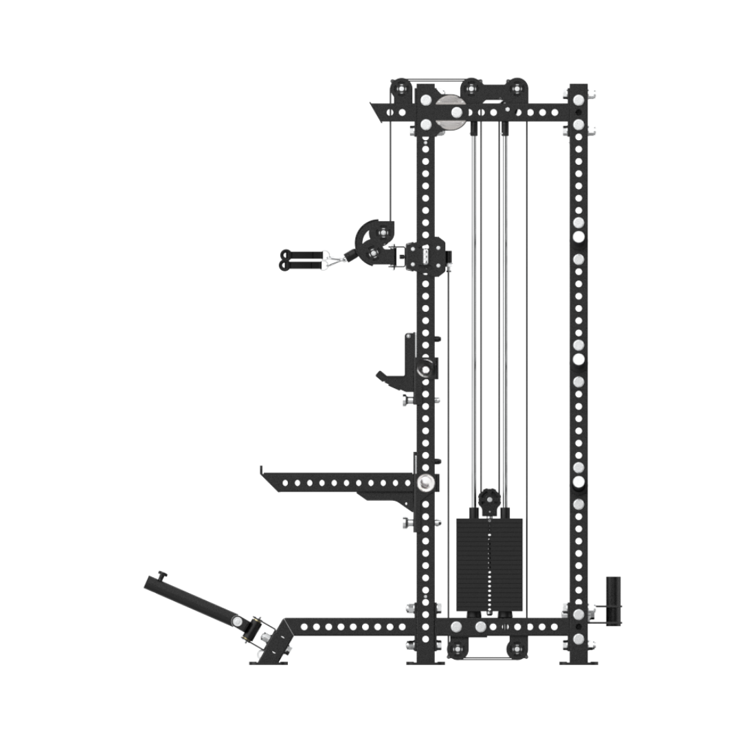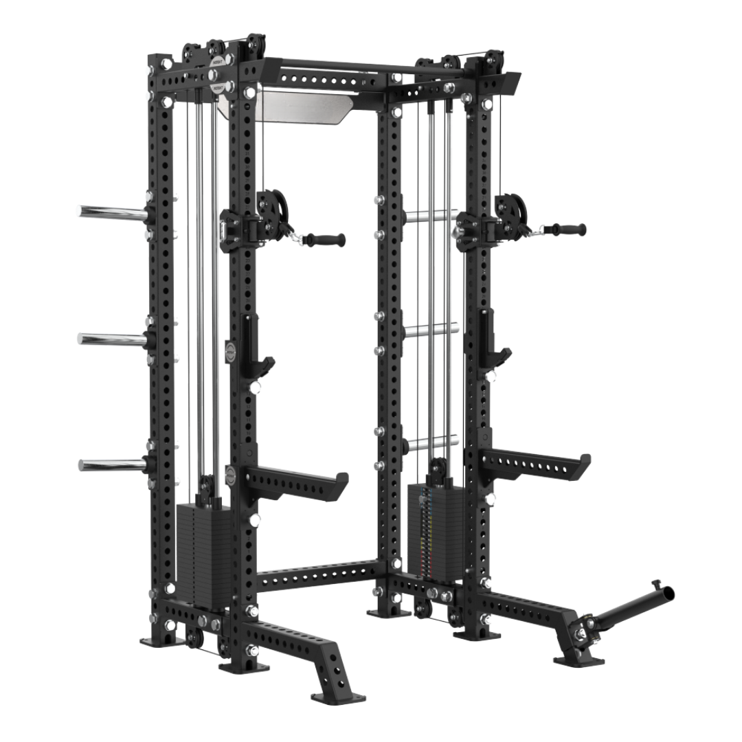 高品質半架式訓練架,配備鋼索交叉訓練器、引體向上桿、安全臂、J型鉤、槓鈴片收納架和地雷架。