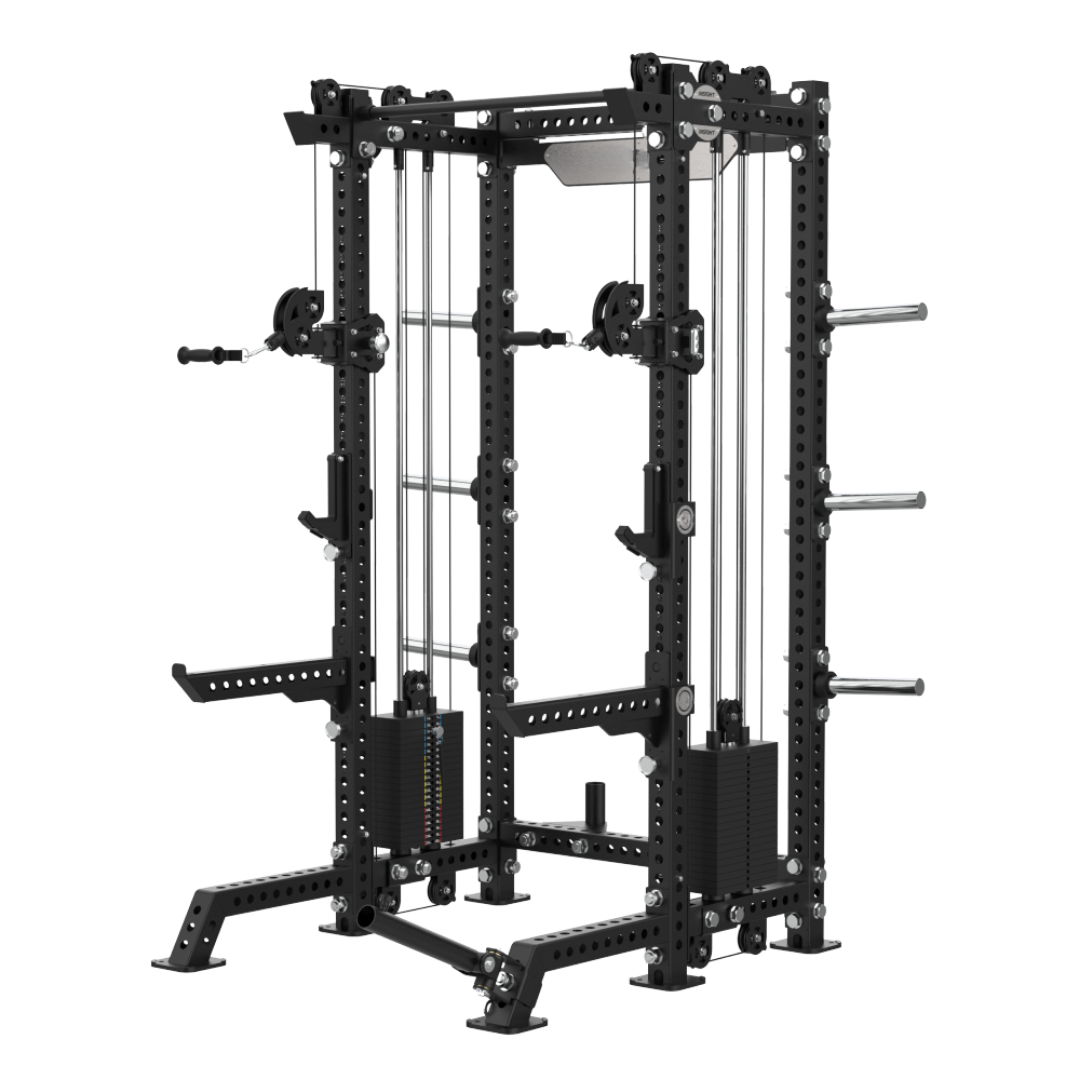 高品質半架式訓練架,配備鋼索交叉訓練器、引體向上桿、安全臂、J型鉤、槓鈴片收納架和地雷架。